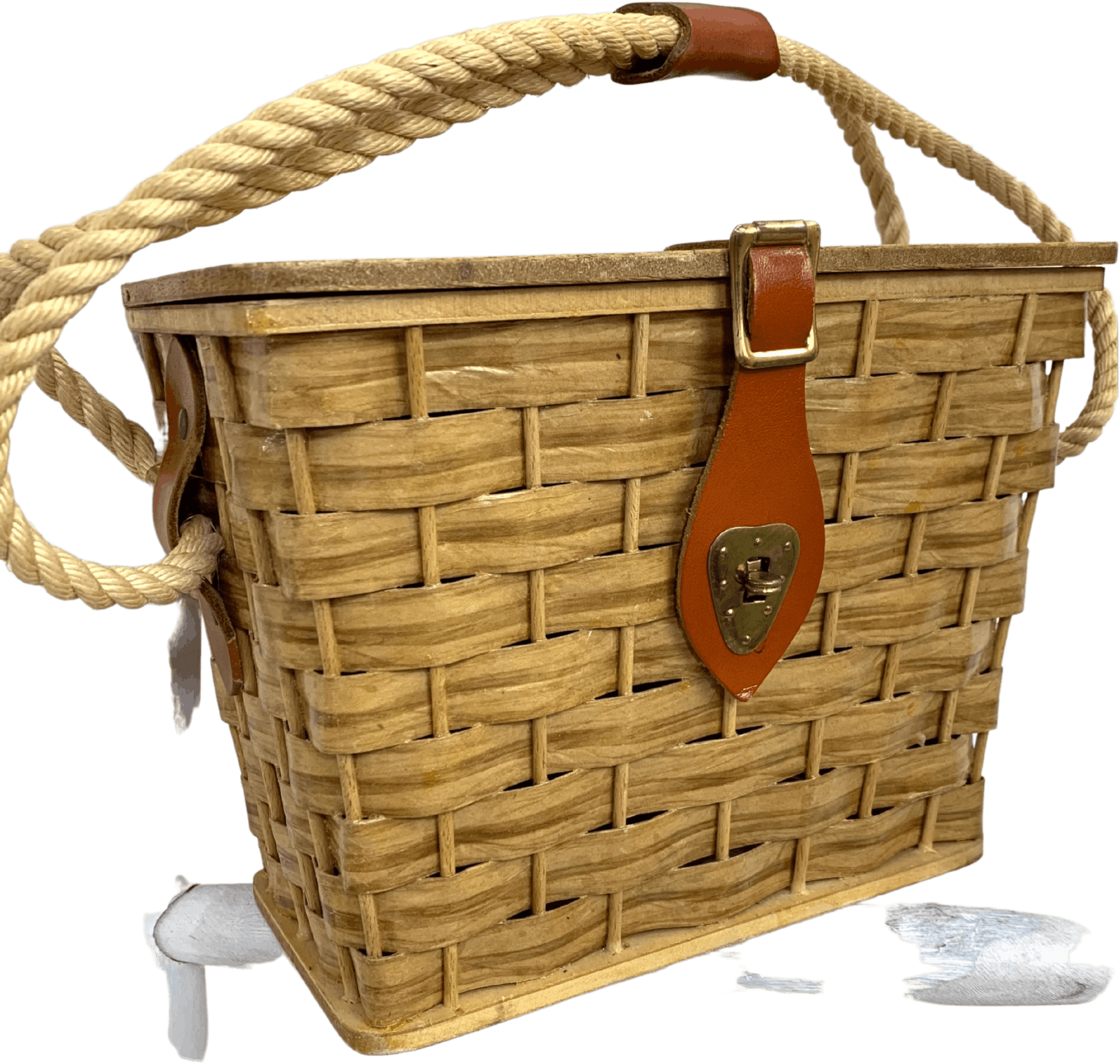Fun vintage picnic basket bag. Hinged wood top with leather and rope trim.