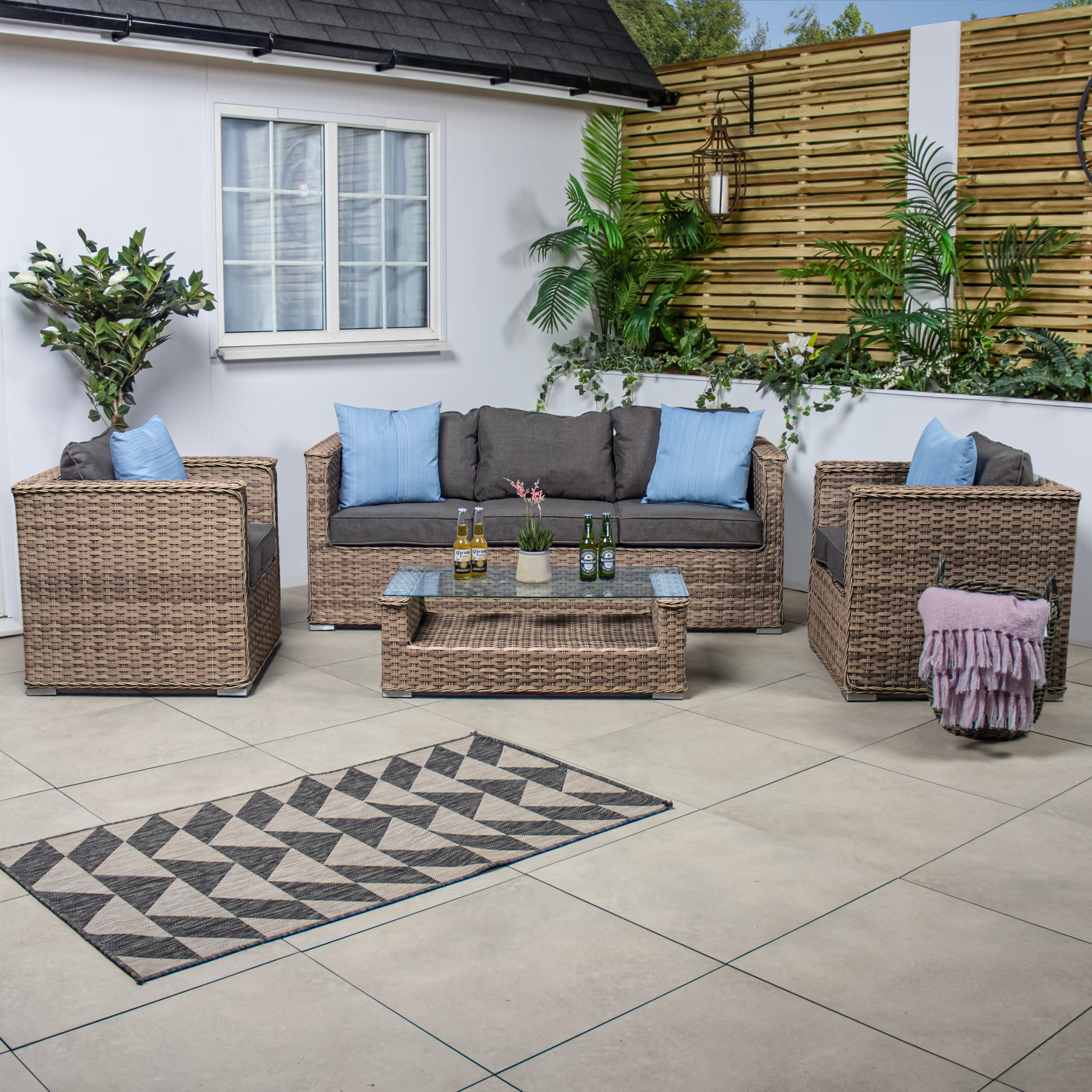The 3 seater rattan outdoor sofa is perfect for relaxing with a friend after a long day and the 2x outdoor garden armchairs are super comfy for reading or relaxing.