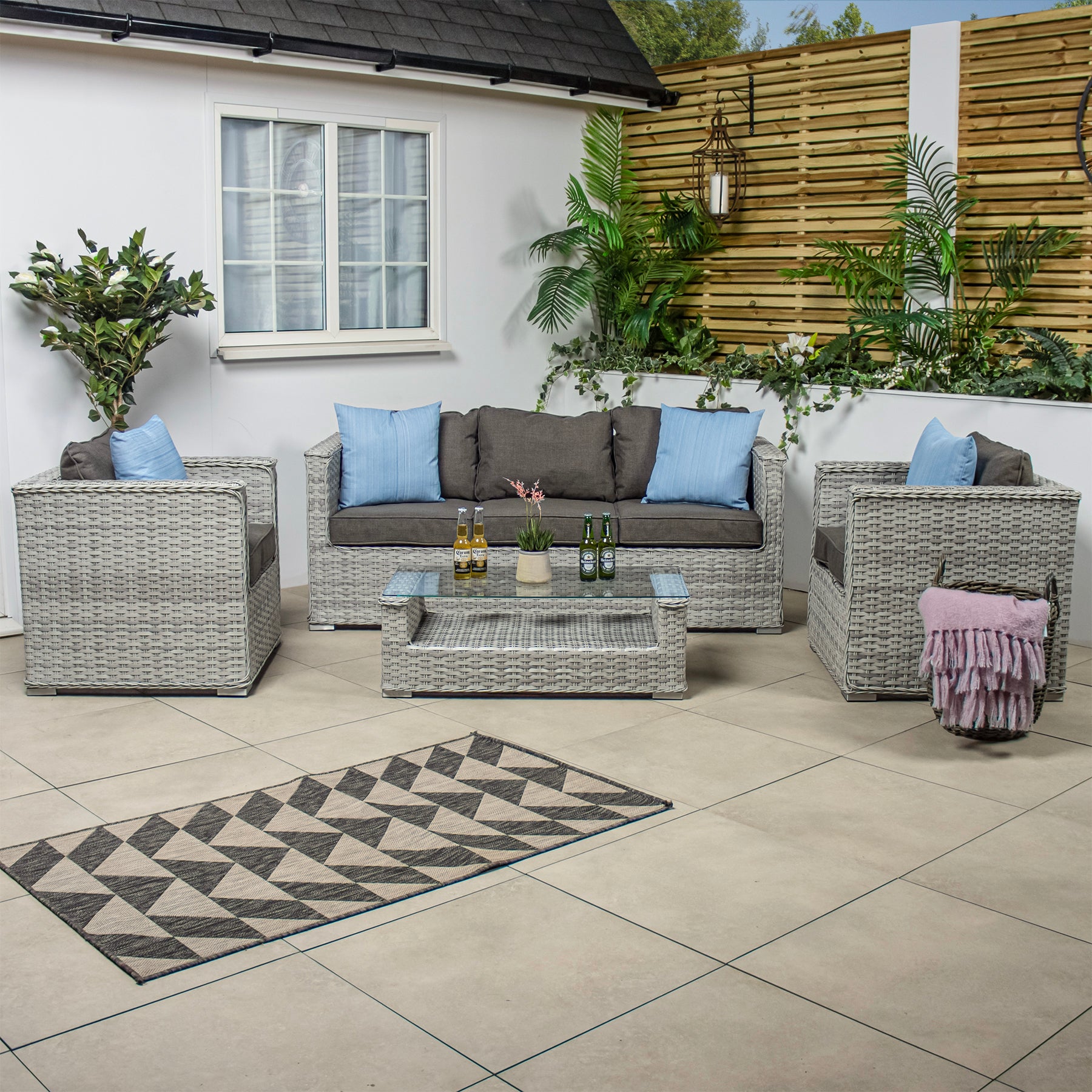 The two outdoor garden armchairs are extraordinarily comfy for reading or relaxing, while the 3 seater rattan outdoor sofa is perfect for relaxing with a friend after a long day.