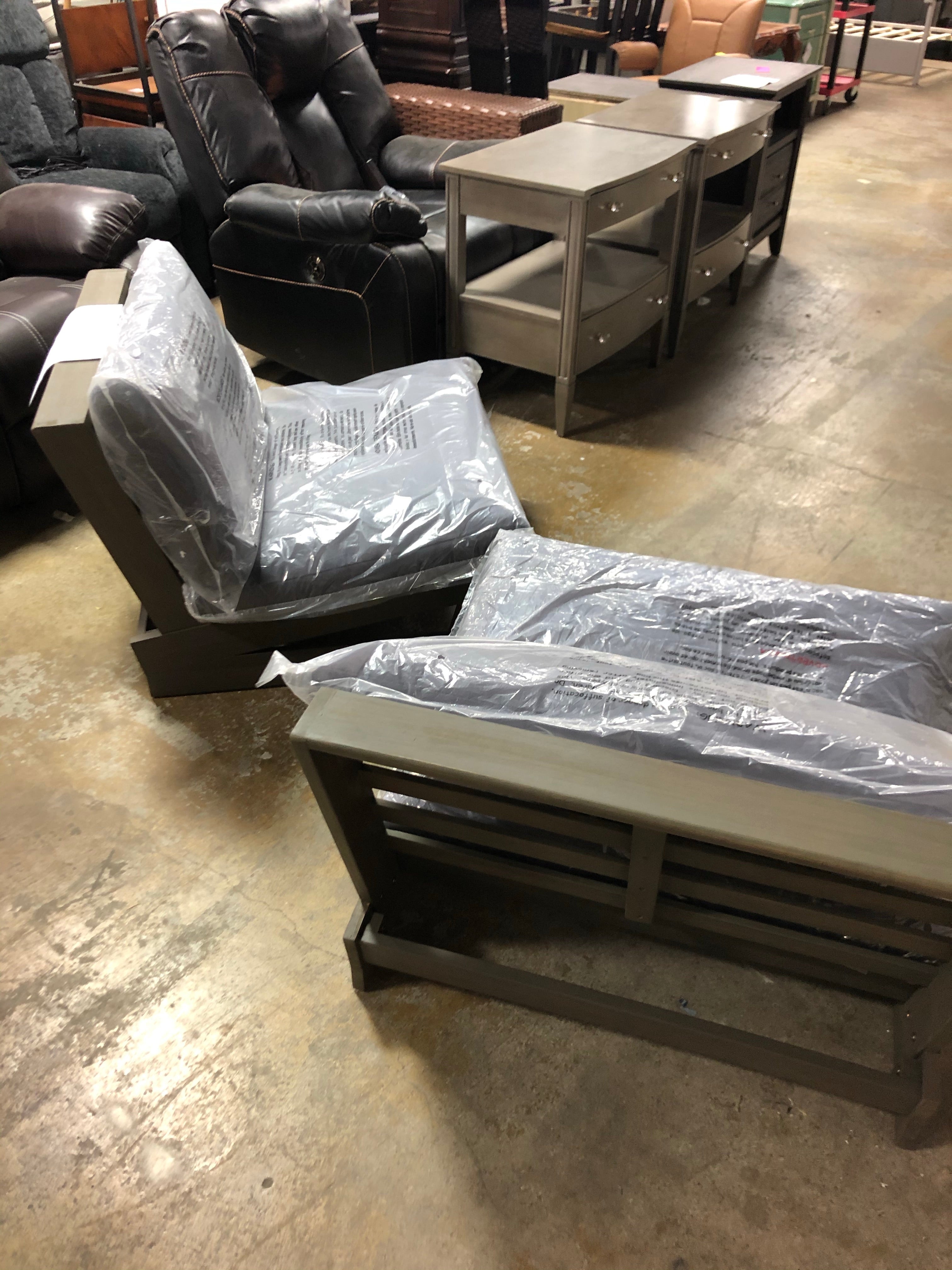 This is an out of box item in great condition. No assembly required. Wood has a gray finish with dark gray cushions. Includes 2 chairs.