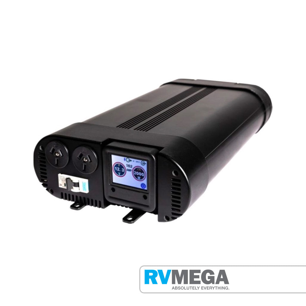 - Removable 2.4 inch Bluetooth colour LCD display with touch screen functionality for switching main unit on/off and displays inverter input voltage, amperage, output AC wattage and also low voltage warning